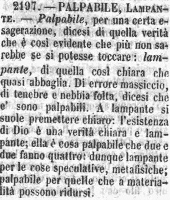 | Palpabile, Lampante - Palpabile, per una certa esagerazione, dicesi di quella verità che è così evidente che più non sarebbe se si potesse toccare: lampante, di quella così chiara che quasi abbaglia. Di errore massiccio, di tenebre e nebbia folta, dicesi che e' sono palpabili. A lampante si suole premettere chiaro: l'esistenza di Dio è una verità chiara e lampante; ella è cosa palpabile che due e due fanno quattro: dunque lampante per le cose speculative, metafisiche; palpabile per quelle che a materialità possono ridursi. [immagine] |