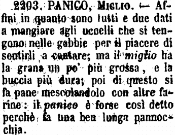 | Panico, Miglio - Affini in quanto sono tutti e due dati a mangiare agli uccelli che si tengono nelle gabbie per il piacere di sentirli a cantare; ma il miglio ha la grana un po' più grossa, e la buccia più dura; poi di questo si fa pane mescolandolo con altre farine: il panico è forse così detto perchè fa una ben lunga pannocchia. [immagine] |