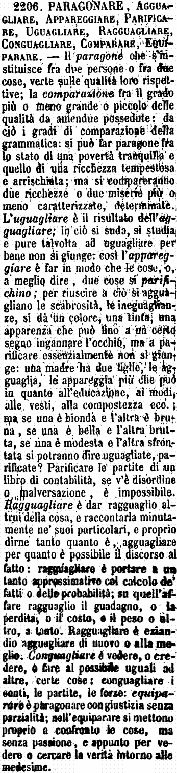 | Paragonare, Agguagliare, Appareggiare, Parificare, Uguagliare, Ragguagliare, Conguagliare, Comparare, Equiparare - Il paragone che s'instituisce fra due persone o fra due cose, verte sulle qualità loro rispettive; la comparazione fra il grado più o meno grande o piccolo delle qualità da amendue possedute: da ciò i gradi di comparazione della grammatica: si può far paragone fra lo stato di una povertà tranquilla e quello di una ricchezza tempestosa e arrischiata; ma si compareranno due ricchezze o due miserie più o meno caratterizzate, determinate. L'uguagliare è il risultato dell'agguagliare; in ciò si suda, si studia e pure talvolta ad uguagliare per bene non si giunge: così l'appareggiare è far in modo che le cose, o, a meglio dire, due cose si parifichino; per riuscire a ciò si agguagliano le scabrosità, le ineguaglianze, si dà un colore, una tinta, una apparenza che può fino a un certo segno ingannare l'occhio, ma a parificare essenzialmente non si giunge: una madre ha due figlie, le agguaglia, le appareggia più che può in quanto all'educazione, ai modi, alle vesti, alla compostezza ecc.; ma se una è bionda e l'altra è bruna, se una è bella e l'altra brutta, se una è modesta e l'altra sfrontata si potranno dire uguagliate, parificate? Parificare le partite di un libro di contabilità, se v'è disordine o malversazione, è impossibile. Ragguagliare è dar ragguaglio altrui della cosa, e raccontarla minutamente ne' suoi particolari, e proprio dirne tanto quanto è, agguagliare per quanto è possibile il discorso al fatto: ragguagliare è portare a un tanto approssimativo col calcolo de' fatti o delle probabilità; su quell'affare ragguaglio il guadagno, o la perdita, o il costo, o il peso o altro, a tanto. Ragguagliare è eziandio agguagliare di nuovo o alla meglio. Conguagliare è vedere, o credere, o fare al possibile uguali ad altre, certe cose: conguagliare i conti, le partite, le forze: equiparare è paragonare con giustizia senza parzialità; nell'equiparare si mettono proprio a confronto le cose, ma senza passione, e appunto per vedere o cercare la verità intorno alle medesime. [immagine] |