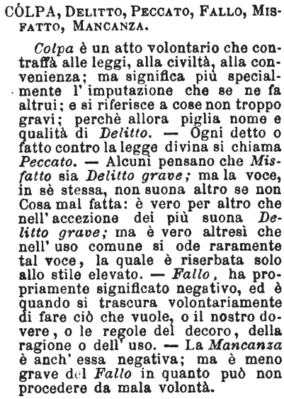 | Peccato, Colpa - Peccato è voce, più che altro, religiosa, e giudicabile dal confessore o da messer Domineddio. - La Colpa è cosa civile, che fa contro le leggi, e che è punita secondo che esse prescrivono. [immagine] |