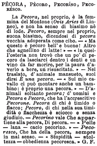 | Pecora, Pecoro, Pecorino, Pecoresco - La Pecora, nel proprio, è la femmina del Montone (Ovis Aries di Linneo), e non ha senso di biasimo nè di lode. Pecoro, sempre nel proprio, suona biasimo, dicendosi di pecora vecchia adoperata come cibo. - «Ma questo è pecoro bell'e buono! Altro che agnellino di latte!» - «In quell'osteria non trovò che un po' di pecoro da lasciarci dentro i denti e un vino da far morire, per la paura d'averlo a bere, un risuscitato.» - Nel traslato, d'animale mansueto, suol dirsi E' una pecora. - «Sul mio cavallo ci può montare anche un bambino: è proprio una pecora.» - D'animali soltanto pecora; d'uomini e Pecora e Pecoro, che ha l'accrescitivo Pecorone. Pecora di chi è timido o fiacco; Pecoro, di chi nella sua timidità o fiacchezza è sciocco e senza giudizio. - Pecorino vale Che appartiene alla pecora, Di pecora. - «Pelle - lana - cacio pecorino.» - Pecoresco, Che ha della pecora, sempre in mal senso. - «Stupidità - stoltezza - obbedienza pecoresca.» G. F. [immagine] |