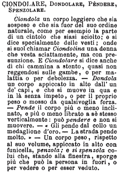 | Ciondolare, Dondolare, Pendere, Spenzolare - Ciondola un corpo leggiero che sia sospeso e che sia fuor del suo ordine naturale, come per esempio la parte di un cintolo che siasi sciolto; e si dice specialmente delle vesti; onde si suol chiamar Ciondolina una donna che vesta sciattamente, ma con presunzione. E Ciondolare si dice anche di chi cammina a stento, quasi non reggendosi sulle gambe, o per malattia o per debolezza. — Dondola un corpo appiccato in alto dall'un de‘ capi, e che si muove in qua e in là senza impeto, o per il proprio peso o mosso da qualsivoglia forza. — Pende il corpo più o meno inclinato, e più o meno librato a sè stesso verticalmente: può pendere e non si muovere. — «Gli pende dal collo un medaglione d'oro. — La strada pende molto.» — Un corpo peso, rispetto al suo volume, appiccato in alto con funicella, penzola; e si spenzola colui che, stando alla flnestra, sporge più che può la persona in fuori, o per vedere o per esser veduto. [immagine] |