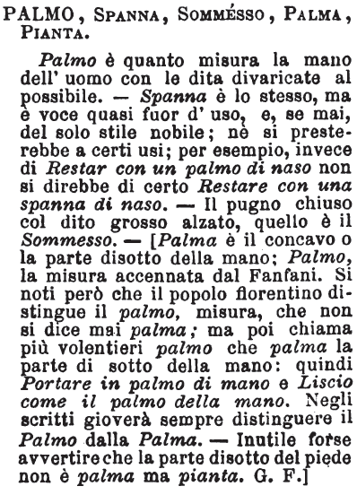 | Palmo, Spanna, Sommesso, Palma, Pianta - Palmo è quanto misura la mano dell'uomo con le dita divaricate al possibile. - Spanna è lo stesso, ma è voce quasi fuor d'uso, e, se mai, del solo stile nobile; nè si presterebbe a certi usi; per esempio, invece di Restar con un palmo di naso non si direbbe di certo Restare con una spanna di naso. - Il pugno chiuso col dito grosso alzato, quello è il Sommesso. - [Palma è il concavo o la parte disotto della mano; Palmo, la misura accennata dal Fanfani. Si noti però che il popolo fiorentino distingue il palmo, misura, che non si dice mai palma; ma poi chiama più volentieri palmo che palma la parte di sotto della mano: quindi Portare in palmo di mano e Liscio come il palmo della mano. Negli scritti gioverà sempre distinguere il Palmo dalla Palma. - Inutile forse avvertire che la parte disotto del piede non è palma ma pianta. G. F.] [immagine] |