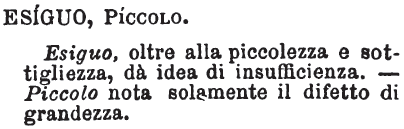 | Esiguo, Piccolo - Esiguo, oltre alla piccolezza e sottigliezza, dà idea di insufficienza.
