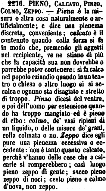 | Pieno, Calcato, Pinzo, Colmo, Zeppo - Piena è la misura o altra cosa naturalmente o artificialmente; e dice una pienezza discreta, conveniente; calcato è il contenuto quando colla forza si fa in modo che, premendo gli oggetti nel recipiente, ve ne stiano di più che la capacità sua non dovrebbe o parrebbe poter contenere; si fa calca nel popolo eziandio quando in un teatro o chiesa o altro luogo ei si accalca e ognuno sta disagiato e stretto di troppo. Pinzo dicesi del ventre, e poi dell'uomo per estensione quando ha troppo mangiato ed è pieno di cibo: colmo, de' vasi ripieni di un liquido, o delle misure de' grani, colla colmata o no. Zeppo dice egli pure una pienezza eccessiva o eccedente: non è tanto quanto calcato, perchè v'hanno delle cose che a calcarle si romperebbero; così luogo pieno zeppo di gente; sacco pieno zeppo di noci; cesto pieno e colmo d'uova, non zeppo. [immagine] |