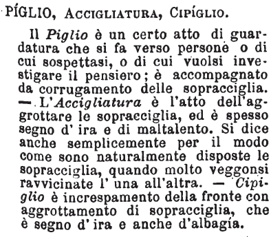 | Piglio, Accigliatura, Cipiglio - Il Piglio è un certo atto di guardatura che si fa verso persone o di cui sospettasi, o di cui vuolsi investigare il pensiero; è accompagnato da corrugamento delle sopracciglia. - L'Accigliatura è l'atto dell'aggrottare le sopracciglia, ed è spesso segno d'ira e di maltalento. Si dice anche semplicemente per il modo come sono naturalmente disposte le sopracciglia, quando molto veggonsi ravvicinate l'una all'altra. - Cipiglio è increspamento della fronte con aggrottamento di sopracciglia, che è segno d'ira e anche d'albagia. [immagine] |