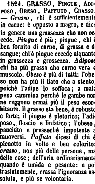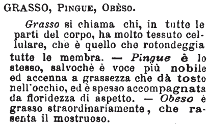 | Grasso, Pingue, Adiposo, Obeso, Paffuto, Crasso - Grasso, chi è sufficientemente in carne: è opposto a magro, e dice in genere una grassezza che non eccede. Pingue è più; pingue, chi è ben fornito di carne, di grassa e di sangue; chi è pingue eccede alquanto in grassezza e grossezza. Adiposo chi ha più grassa che carne vera o muscolo. Obeso è più di tutti: l'obeso non ha più il fiato che a stento, poichè l'adipe lo soffoca; a malapena cammina perchè le gambe non ne reggono ormai più il peso esorbitante. Il grasso sta bene, è robusto e forte; il pingue è pletorico; l'adiposo, floscio e linfatico; l'obeso, panciuto e pressochè impotente a muoversi. Paffuto dicesi di chi è pienotto in volto e ben colorito: crasso, non più delle persone, ma delle cose; dell'aria ordinariamente quando è umida e pesante: e poi traslatamente, crassa l'ignoranza assoluta, e più se volontaria. [immagine] |