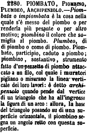 | Piombato, Piombino, Plumbeo, Archipenzolo - Piombata o impiombata è la cosa nella quale s'è messo del piombo o per renderla più pesante o per altro motivo; piombino il colore che somiglia al piombo. Plumbeo, di di piombo o come di piombo. Piombato, participio, caduto a piombo; piombino, sostantivo, strumento fatto d'un pezzetto di piombo attaccato a un filo, col quale i muratori pigliano o misurano la linea verticale dei loro lavori: è detto archipenzolo quando pende dal vertice di un triangolo che ha all'ingrosso la figura di un arco: allora, la base del triangolo posando su di una superficie orizzontale, il piombino segna un angolo retto con questa superficie. [immagine] |