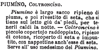 | Piumino, Coltroncino - Piumino è largo sacco ripieno di piuma, e poi rivestito di seta, che si tiene sul letto giù da' piedi, per tenerli caldi la notte. - Coltroncino è piccolo copertojo raddoppiato, ripieno di cotone, ricoperto di seta e impuntito, con nappettine anch'esse di seta. Serve all'uso medesimo del Piumino. [immagine] |