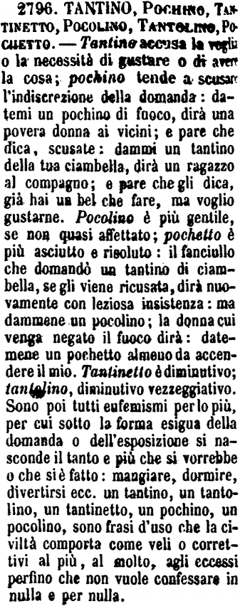 | Tantino, Pochino, Tantinetto, Pocolino, Tantolino, Pochetto - Tantino accusa la voglia o la necessità di gustare o di avere la cosa; pochino tende a scusare l'indiscrezione della domanda: datemi un pochino di fuoco, dirà una povera donna ai vicini; e pare che dica, scusate: dammi un tantino della tua ciambella, dirà un ragazzo al compagno; e pare che gli dica, già hai un bel che fare, ma voglio gustarne. Pocolino è più gentile, se non quasi affettato; pochetto è più asciutto e risoluto: il fanciullo che domandò un tantino di ciambella, se gli viene ricusata, dirà nuovamente con leziosa insistenza: ma dammene un pocolino; la donna cui venga negato il fuoco dirà: datemene un pochetto almeno da accendere il mio. Tantinetto è diminutivo; tantolino, diminutivo vezzeggiativo. Sono poi tutti eufemismi per lo più, per cui sotto la forma esigua della domanda o dell'esposizione si nasconde il tanto e più che si vorrebbe o che si è fatto: mangiare, dormire, divertirsi ecc. un tantino, un tantolino, un tantinetto, un pochino, un pocolino, sono frasi d'uso che la civiltà comporta come veli o correttivi al più, al molto, agli eccessi perfino che non vuole confessare in nulla e per nulla. [immagine] |