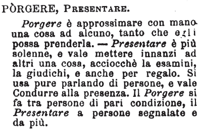 | Porgere, Presentare - Porgere è approssimare con mano una cosa ad alcuno, tanto che egli possa prenderla. - Presentare è più solenne, e vale mettere innanzi ad altri una cosa, acciocchè la esamini, la giudichi, e anche per regalo. Si usa pure parlando di persone, e vale Condurre alla presenza. Il Porgere si fa tra persone di pari condizione, il Presentare a persone segnalate e da più. [immagine] |