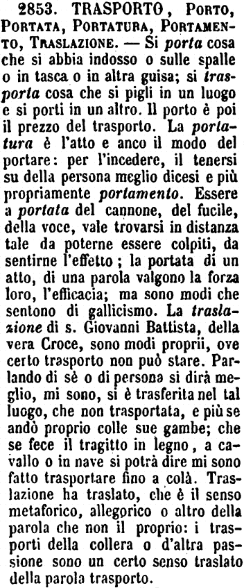 | Trasporto, Porto, Portata, Portatura, Portamento, Traslazione - Si porta cosa che si abbia indosso o sulle spalle o in tasca o in altra guisa; si trasporta cosa che si pigli in un luogo e si porti in un altro. Il porto è poi il prezzo del trasporto. La portatura è l'atto e anco il modo del portare: per l'incedere, il tenersi su della persona meglio dicesi e più propriamente portamento. Essere a portata del cannone, del fucile, della voce, vale trovarsi in distanza tale da poterne essere colpiti, da sentirne l'effetto; la portata di un atto, di una parola valgono la forza loro, l'efficacia; ma sono modi che sentono di gallicismo. La traslazione di s. Giovanni Battista, della vera Croce, sono modi proprii, ove certo trasporto non può stare. Parlando di sè o di persona si dirà meglio, mi sono, si è trasferita nel tal luogo, che non trasportata, e più se andò proprio colle sue gambe; che se fece il tragitto in legno, a cavallo o in nave si potrà dire mi sono fatto trasportare fino a colà. Traslazione ha traslato, che è il senso metaforico, allegorico o altro della parola che non il proprio: i trasporti della collera o d'altra passione sono un certo senso traslato della parla trasporto. [immagine] |