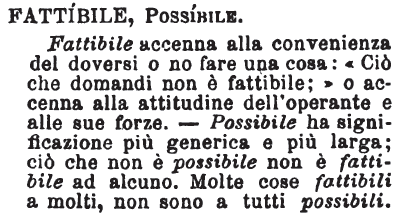 | Fattibile, Possibile - Fattibile accenna alla convenienza del doversi o no fare una cosa: «Ciò che domandi non è fattibile;» o accenna alla attitudine dell'operante e alle sue forze. - Possibile ha significazione più generica e più larga; ciò che non è possibile non è fattibile ad alcuno. Molte cose sono fattibili a molti, non sono a tutti possibili. [immagine] |