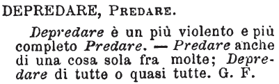 | Depredare, Predare - Depredare è un più violento e più completo Predare.-Predare anche di una cosa sola fra molte; Depredare di tutte o quasi tutte. G. F. [immagine] |