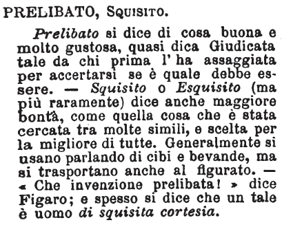 | Prelibato, Squisito - Prelibato si dice di cosa buona e molto gustosa, quasi dica Giudicata tale da chi prima l'ha assaggiata per accertarsi se è quale debbe essere. - Squisito o Esquisito (ma più raramente) dice anche maggiore bontà, come quella cosa che è stata cercata tra molte simili, e scelta per la migliore di tutte. Generalmente si usano parlando di cibi e bevande, ma si trasportano anche al figurato. - «Che invenzione prelibata!» dice Figaro; e spesso si dice che un tale è uomo di squisita cortesia. [immagine] |