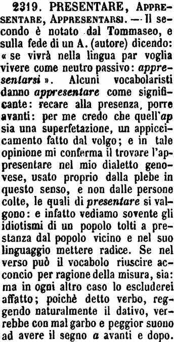| Presentare, Appresentare, Appresentarsi - Il secondo è notato dal Tommaseo, e sulla fede di un A. (autore) dicendo: « se vivrà nella lingua par voglia vivere come neutro passivo: appresentarsi ». Alcuni vocabolaristi danno appresentare come significante: recare alla presenza, porre avanti: per me credo che quell'ap sia una superfetazione, un appiccicamento fatto dal volgo; e in tale opinione mi conferma il trovare l'appresentare nel mio dialetto genovese, usato proprio dalla plebe in questo senso, e non dalle persone colte, le quali di presentare si valgono: e infatto vediamo sovente gli idiotismi di un popolo tolti a prestanza dal popolo vicino e nel suo linguaggio mettere radice. Se nel verso può il vocabolo riuscire acconcio per ragione della misura, sia: ma in ogni altro caso lo escluderei affatto; poichè detto verbo, reggendo naturalmente il dativo, verrebbe con mal garbo e peggior suono ad avere il segno a avanti e dopo. [immagine] |