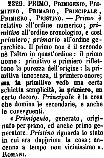 Primo, Primigenio, Primitivo, Primario, Principale, Primiero, Pristino - Primo è relativo all'ordine numerico; primitivo all'ordine cronologico, e così primiero; primario all'ordine gerarchico. Il primo non è il secondo nè l'altro in quest'ordine: il primo uomo: primitivo e primiero riflettono la purezza dell'origine: la primitiva innocenza, il primiero onore; ma in primitivo vedo una certa schietta semplicità, in primiero, un certo decoro. Principale è la cosa che domina le secondarie, e anche le conseguenti.