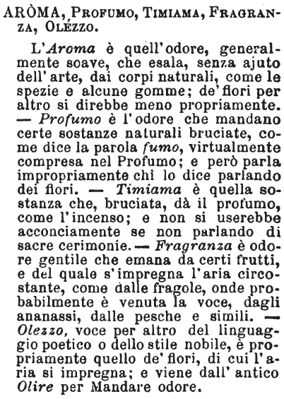 | Aroma, Profumo, Timiama, Fragranza, Olezzo - L'Aroma è quell'odore, generalmente soave, che esala, senza ajuto dell'arte, dai corpi naturali, come le spezie e alcune gomme; de' fiori per altro si direbbe meno propriamente. - Profumo è l'odore che mandano certe sostanze naturali bruciate, come dice la parola fumo, virtualmente compresa nel Profumo; e però parla impropriamente chi lo dice parlando dei fiori. - Timiama è quella sostanza che, bruciata, dà il profumo, come l'incenso; e non si userebbe acconciamente se non parlando di sacre cerimonie. - Fragranza è odore gentile che emana da certi frutti, e del quale s'impregna l'aria circostante, come dalle fragole, onde probabilmente è venuta la voce, dagli ananassi, dalle pasche e simili. - Olezzo, voce per altro del linguaggio poetico o dello stile nobile, è propriamente quello de' fiori, di cui l'aria si impregna; e viene dall'antico Olire per Mandare odore. [immagine] |