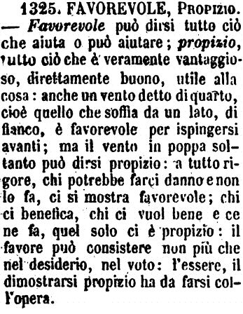 | Favorevole, Propizio - Favorevole può dirsi tutto ciò che aiuta o può aiutare; propizio, tutto ciò che è veramente vantaggioso, direttamente buono, utile alla cosa: anche un vento detto di quarto, cioè quello che soffia da un lato, di fianco, è favorevole per ispingersi avanti; ma il vento in poppa soltanto può dirsi propizio: a tutto rigore, chi potrebbe farci danno e non lo fa, ci si mostra favorevole; chi ci benefica, chi ci vuol bene e ce ne fa, quel solo ci è propizio: il favore può consistere non più che nel desiderio, nel voto: l'essere, il dimostrarsi propizio ha da farsi coll'opera. [immagine] |