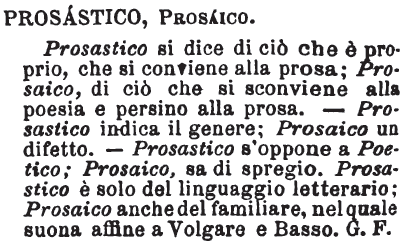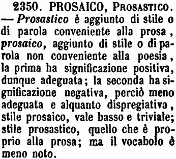 | Prosaico, Prosastico - Prosastico è aggiunto di stile o di parola conveniente alla prosa, prosaico, aggiunto di stile o di parola non conveniente alla poesia, la prima ha significazione positiva, dunque adeguata; la seconda ha significazione negativa, perciò meno adeguata e alquanto dispregiativa, stile prosaico, vale basso e triviale; stile prosastico, quello che è proprio alla prosa; ma il vocabolo è meno noto. [immagine] |