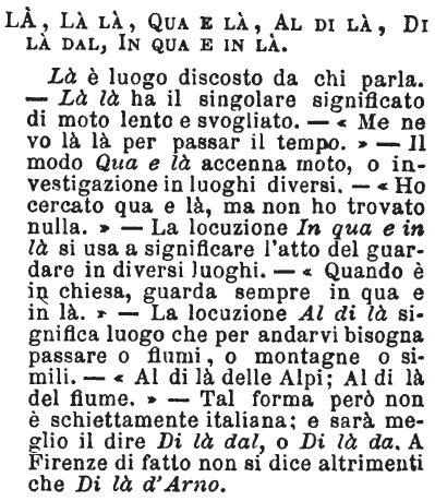| Là, Là là, Qua e là, Al di là, Di là dal, In qua e in là - Là è luogo discosto da chi parla. - Là là ha il singolare significato di moto lento e svogliato. - «Me ne vo là là per passare il tempo.» - Il modo Qua e là accenna moto, o investigazione in luoghi diversi. - «Ho cercato qua e là, ma non ho trovato nulla.» - La locuzione In qua e in là si usa a significare l'atto del guardare in diversi luoghi. - «Quando è in chiesa, guarda sempre in qua e in là.» - La locuzione Al di là significa luogo che per andarvi bisogna passare o fiumi, o montagne o simili. - «Al di là delle Alpi; Al di là del fiume.» - Tal forma però non è schiettamente italiana; e sarà meglio il dire Di là dal, o Di là da. A Firenze di fatto non si dice altrimenti che Di là d'Arno . [immagine] |