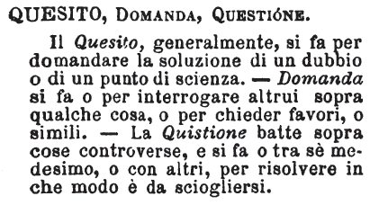 | Quesito, Domanda, Questione - Il Quesito, generalmente, si fa per domandare la soluzione di un dubbio o di un punto di scienza. Domanda si fa o per interrogare altrui sopra qualche cosa, o per chieder favori, o simili. La Quistione batte sopra cose controverse, e si fa o tra sè medesimo, o con altri, per risolvere in che modo è da sciogliersi. [immagine] |