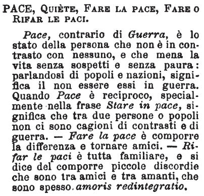 | Pace, Quiete, Fare la pace, Fare o rifar le paci - Pace, contrario di Guerra, è lo stato della persona che non è in contrasto con nessuno, e che mena la vita senza sospetti e senza paura: parlandosi di popoli e nazioni, significa il non essere essi in guerra. Quando Pace è reciproco, specialmente nella frase Stare in pace, significa che tra due persone o popoli non ci sono cagioni di contrasti e di guerra. - Fare la pace è comporre la differenza e tornare amici. - Rifar le paci è tutta familiare, e si dice del comporre piccole discordie che sono tra amici e tra amanti, che sono spesso amoris redintegratio. [immagine] |