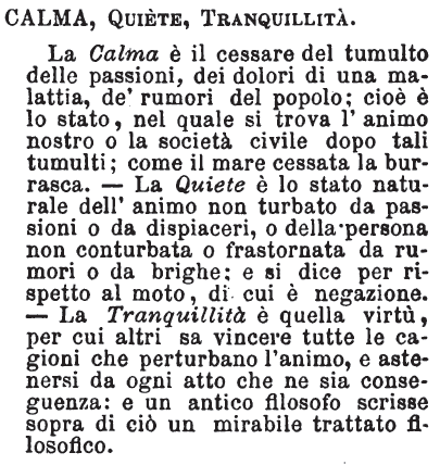 | Calma, Quiete, Tranquillità - La Calma è il cessare del tumulto delle passioni, dei dolori di una malattia, de' rumori del popolo; cioè è lo stato, nel quale si trova l'animo nostro o la società civile dopo tali tumulti; come il mare cessata la burrasca. - La Quiete è lo stato naturale dell'animo non turbato da passioni o da dispiaceri, o della persona non conturbata o frastornata da rumori o da brighe; e si dice per rispetto al moto, di cui è negazione. - La Tranquillità è quella virtù, per cui altri sa vincere tutte le cagioni che perturbano l'animo, e astenersi da ogni atto che ne sia conseguenza; e un antico filosofo scrisse sopra di ciò un mirabile trattato filosofico. [immagine] |
