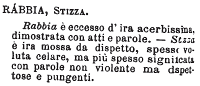 | Rabbia, Stizza - Rabbia è eccesso d'ira acerbissima dimostrata con atti e parole. - Stizza è ira mossa da dispetto, spesso voluta celare, ma più spesso significata con parole non violente ma dispettose e pungenti. [immagine] |