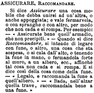 | Assicurare, Raccomandare - Si dice Assicurare una cosa mobile che debba unirsi ad un'altra, o anche appoggiata; e vale fermarvela, o con spranghe o con altro, per modo che non cada e si rompa. Per esempio: - «Assicurate bene quell'armadio, chè non precipiti.» - Quando si dice Raccomandare, si intende di legare con fune, o altro, una cosa che sta sospesa, o si cala dall'alto, o tenendo la fune in mano, o fermandola forte al muro, a un albero, ecc., affinchè tal cosa non cada e si rompa. E si dice così della cosa come della fune. - «Legalo, e raccomanda la fune a quell'albero.» - «Bada, nell'alzar quella trave, raccomandala bene a una fune.» [immagine] |