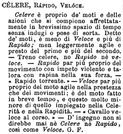 | Celere, Rapido, Veloce - Celere è proprio de' moti e delle azioni che si compiono affrettatamente in brevissimo spazio di tempo senza indugi o pose di sorta. Detto de' moti, è meno di Veloce e più di Rapido; men leggermente agile e presto del primo e più del secondo. - Treno celere, no Rapido nè velore. - Rapido par più proprio del movimento con impeto violento e talora con rapina nella sua forza. - «Rapido torrente.» - Veloce par più proprio del moto agile nella prestezza che dei movimenti; è del moto fatto in breve tempo, e questo molto minore di quello impiegato nella Celerità e nella Rapidità. - «Cavallo veloce al corso.» - D'ingegno non si direbbe mai nè Celere nè Rapido, così come Veloce. G. F. [immagine] |