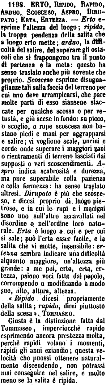 | Erto, Ripido, Rapido, Arduo, Scosceso, Aspro, Dirupato; Erta, Ertezza - Erto esprime l'altezza del luogo; ripido, la troppa pendenza della salita che a luogo erto mette; arduo, la difficoltà del salire, del superare gli ostacoli che si frappongono tra il punto di partenza e la meta: questo ha senso traslato anche più sovente che proprio. Scosceso esprime disuguaglianze tali sulla faccia del terreno per cui uno deve arrampicarsi, che pare molte parti di essere siansene staccate per qualche scossa o per vetustà, e giù scese in fondo: su picco, o scoglio, o rupe scoscesa non bastano piedi e mani per aggrapparsi e salire; vi vogliono scale, uncini e corde onde superare i maggiori vani o rientramenti di terreno lasciati dai supposti o veri scoscendimenti. Aspro indica scabrosità e durezza, ma pure superabile colla pazienza e colla fermezza: ha senso traslato altresì. Dirupato è più che scosceso, e dicesi proprio di luogo pietroso, e in cui le rupi e i macigni sono uno sull'altro accavallati nel disordine o nell'ordine loro naturale. Erta è luogo a cui e per cui si sale; può l'erta esser facile, e la salita che vi mette, insensibile: ertezza sembra indicare una difficoltà alquanto maggiore, un'altezza più grande: a me poi, erto, erta, ertezza, paiono voci fatte dal popolo, corrompendo o modificando a modo suo, alto, altura, altezza.