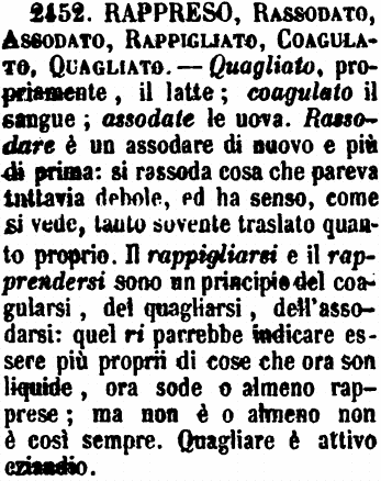 | Rappreso, Rassodato, Assodato, Rappigliato, Coagulato, Quagliato - Quagliato, propriamente, il latte; coagulato il sangue; assodate le uova. Rassodare è un assodare di nuovo e più di prima: si rassoda cosa che pareva tuttavia debole, ed ha senso, come si vede, tanto sovente traslato quanto proprio. Il rappigliarsi e il rapprendersi sono un principio del coagularsi, del quagliarsi, dell'assodarsi: quel ri parrebbe indicare essere più proprii di cose che ora son liquide, ora sode o almeno rapprese; ma non è o almeno non è così sempre. Quagliare è attivo eziandio. [immagine] |