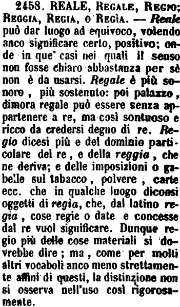 | Reale, Regale, Regio; Reggia, Regia, o Regìa - Reale può dar luogo ad equivoco, volendo anco significare certo, positivo; onde in que' casi nei quali il senso non fosse chiaro abbastanza per sè non è da usarsi. Regale è più sonoro, più sostenuto: poi palazzo, dimora regale può essere senza appartenere a re, ma così sontuoso e ricco da credersi degno di re. Regio dicesi più e del dominio particolare del re, e della reggia, che ne deriva; e delle imposizioni o gabelle sul tabacco, polvere, carte ecc. che in qualche luogo diconsi oggetti di regìa, che, dal latino regia, cose regie o date e concesse dal re vuol significare. Dunque regio più delle cose materiali si dovrebbe dire; ma, come per molti altri vocaboli anco meno strettamente affini di questi, la distinzione non si osserva nell'uso così rigorosamente. [immagine] |