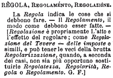 | Regola, Regolamento, Regolazione - La Regola indica le cose che si debbono fare. - Il Regolamento, il modo come debbono esser fatte. -[Regolazione è propriamente L'atto e l'effetto del regolare; come Regolazione del Tevere - delle imposte e simili, e può tener le veci della brutta Regolarizzazione, quando, a seconda dei casi, non sia più opportuno sostituirle Regolatezza, Regolarità, Regola o Regolamento. G. F.] [immagine] |