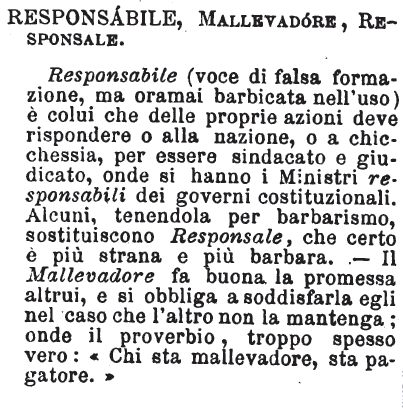 | Responsabile, Mallevadore, Responsale - Responsabile (voce di falsa formazione, ma oramai barbicata nell'uso) è colui che delle proprie azioni deve rispondere o alla nazione, o a chicchessia, per essere sindacato e giudicato, onde si hanno i Ministri responsabili dei governi costituzionali. Alcuni, tenendola per barbarismo, sostituiscono Responsale, che certo è più strana e più barbara. - Il Mallevadore fa buona la promessa altrui, e si obbliga a soddisfarla egli nel caso che l'altro non la mantenga; onde il proverbio, troppo spesso vero: «Chi sta mallevadore, sta pagatore.» [immagine] |