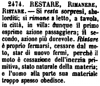 | Restare, Rimanere, Ristare - Si resta sorpresi, sbalorditi; si rimane a letto, a tavola, in città, in villa: dunque il primo esprime azione passaggiera; il secondo, azione più durevole. Ristare è proprio fermarsi, cessare dal moto, star di nuovo fermi, perché il moto è cessazione dell'inerzia primitiva, stato naturale della materia; e l'uomo alla parte sua materiale troppo spesso obedisce. [immagine] |
