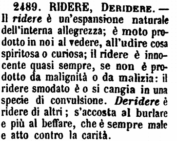 | Ridere, Deridere - Il ridere è un'espansione naturale dell'interna allegrezza; è moto prodotto in noi al vedere, all'udire cosa spiritosa o curiosa; il ridere è innocente quasi sempre, se non è prodotto da malignità o da malizia: il ridere smodato è o si cangia in una specie di convulsione. Deridere è ridere di altri; s'accosta al burlare e più al beffare, che è sempre male e atto contro la carità. [immagine] |