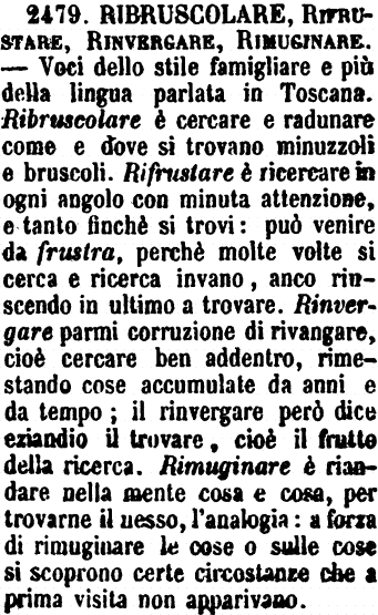 | Ribruscolare, Rifrustare, Rinvergare, Rimuginare - Voci dello stile famigliare e più della lingua parlata in Toscana. Ribruscolare è cercare e radunare come e dove si trovano minuzzoli e bruscoli. Rifrustare è ricercare in ogni angolo con minuta attenzione, e tanto finchè si trovi: può venire da frustra, perchè molte volte si cerca e ricerca invano, anco riuscendo in ultimo a trovare. Rinvergare parmi corruzione di rivangare, cioè cercare ben addentro, rimestando cose accumulate da anni e da tempo; il rinvergare però dice eziandio il trovare, cioè il frutto della ricerca. Rimuginare è riandare nella mente cosa e cosa, per trovarne il nesso, l'analogia: a forza di rimuginare le cose o sulle cose si scoprono certe circostanze che a prima visita non apparivano. [immagine] |