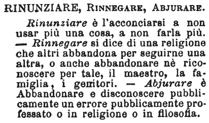 | Rinunziare, Rinnegare, Abjurare - Rinunziare è l'acconciarsi a non usar più una cosa, a non farla più. - Rinnegare si dice di una religione che altri abbandona per seguirne una altra, o anche abbandonare né riconoscere per tale, il maestro, la famiglia, i genitori. - Abjurare è Abbandonare e disconoscere pubblicamente un errore pubblicamente professato o in religione o in filosofia. [immagine] |