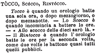 | Tocco, Scocco, Rintocco - Tocco è quando un orologio batte una sola ora, o dopo mezzogiorno o dopo mezzanotte. - Lo Scocco è quando incomincia a battere le ore. - « Allo scocco delle dieci sarò là. » - Il Rintocco è quando l'orologio batte le ore per la seconda volta, come due volte le battono quasi tutti quelli pubblici. [immagine] |