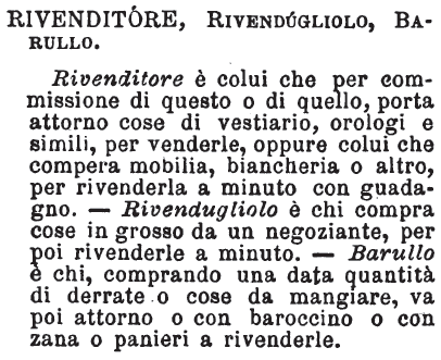 | Rivenditore, Rivendugliolo, Barullo - Rivenditore è colui che per commissione di questo o di quello, porta attorno cose di vestiario, orologi e simili, per venderle, oppure colui che compera mobilia, biancheria o altro, per rivenderla a minuto con guadagno. - Rivendugliolo è chi compra cose in grosso da un negoziante, per poi rivenderle a minuto. - Barullo è chi, comprando una data quantità di derrate o cose da mangiare, va poi attorno e con baroccino o con zana o panieri a rivenderle. [immagine] |