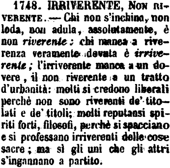 | Irriverente, Non riverente - Chi non s'inchina, non loda, non adula, assolutamente, è non riverente; chi manca a riverenza veramente dovuta è irriverente; l'irriverente manca a un dovere, il non riverente a un tratto d'urbanità: molti si credono liberali perchè non sono riverenti de' titolati e de' titoli; molti reputansi spiriti forti, filosofi, perchè si spacciano e si professano irriverenti delle cose sacre; ma si gli uni che gli altri s'ingannano a partito. [immagine] |