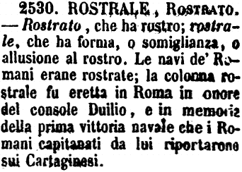 | Rostrale, Rostrato - Rostrato, che ha rostro; rostrale, che ha forma, o somiglianza, o allusione al rostro. Le navi de' Romani erano rostrate; la colonna rostrale fu eretta in Roma in onore del console Duilio, e in memoria della prima vittoria navale che i Romani capitanati da lui riportarono sui Cartaginesi. [immagine] |