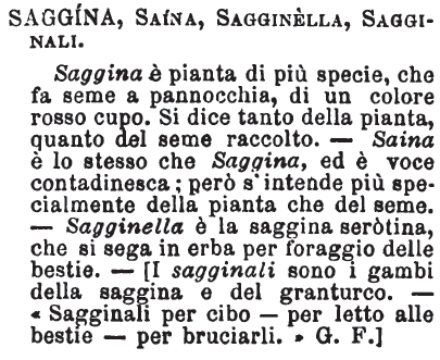 | Saggina, Saina, Sagginella, Sagginali - Saggina è pianta di più specie, che fa seme a pannocchia, di un colore rosso cupo. Si dice tanto della pianta, quanto del seme raccolto. - Saina è lo steso che Saggina, ed è voce contadinesca; però s'intende più specificamente della pianta che del seme. - Sagginella è la saggina seròtina, che si sega in erba per foraggio delle bestie. - [I sagginali sono i gambi della saggina e del granturco. - «Sagginali per cibo - per letto alle bestie - per bruciarli.» G.F.] [immagine] |