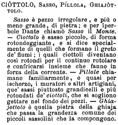 | Ciottolo, Sasso, Pillola, Ghiajottolo - Sasso è pezzo irregolare, e più o meno grande, di pietra; e per iperbole Dante chiamò Sasso il Monte. - Ciottolo è sasso piccolo, di forma rotondeggiante, e si dice specialmente di quelli che formano il greto de' fiumi; i quali ciottoli diventano così rotondi per il continuo rotolare e confricarsi insieme che fanno in forza della corrente. - Pillole chiamano familiarmente, e quasi per ischerzo, i muratori e altri artigiani, que' sassi piuttosto grandicelli e più rotondati de' ciottoli, che si sogliono gettare nel fondo dei pozzi, - Ghiajottolo è quella pietra della ghiaja che passa la grandezza comune dei piccoli sassolini che la compongono. [immagine] |