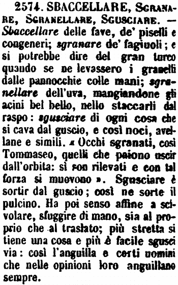 | Sbaccellare, Sgranare, Sgranellare, Sgusciare - Sbaccellare delle fave, de' piselli e congeneri; sgranare de' fagiuoli; e si potrebbe dire del gran turco quando se ne levassero i granelli dalle pannocchie colle mani; sgranellare dell'uva, mangiandone gli acini bel bello, nello staccarli dal raspo: sgusciare di ogni cosa che si cava dal guscio, e così noci, avellane e simili. «Occhi sgranati, così Tommaseo, quelli che paiono uscir dall'orbita: sì son rilevati e con tal forza si muovono». Sgusciare è sortir dal guscio; così ne sorte il pulcino. Ha poi senso affine a scivolare, sfuggire di mano, sia al proprio che al traslato; più stretta si tiene una cosa e più è facile sgusci via: così l'anguilla e certi uomini che nelle opinioni loro anguillano sempre. [immagine] |