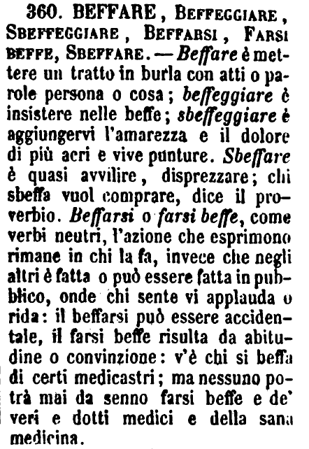 | Beffare, Beffeggiare, Sbeffeggiare, Beffarsi, Farsi beffe, Sbeffare - Beffare è mettere un tratto in burla con atti o parole persona o cosa; beffeggiare è insistere nelle beffe; sbeffeggiare è aggiungervi l'amarezza e il dolore di più acri e vive punture. Sbeffare è quasi avvilire, disprezzare; chi sbeffa vuol comprare, dice il proverbio. Beffarsi o farsi beffe, come verbi neutri, l'azione che esprimono rimane in chi la fa, invece che negli altri è fatta o può essere fatta in pubblico, onde chi sente vi applauda o rida: il beffarsi può essere accidentale, il farsi beffe risulta da abitudine o convinzione: v'è chi si beffa di certi medicastri; ma nessuno potrà mai da senno farsi beffe e de' veri e dotti medici e della sana medicina. [immagine] |