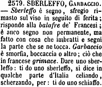 | Sberleffo, Garbaccio - Sberleffo è segno, sfregio rimasto sul viso in seguito di ferita; risponde alla balafre de' Francesi; è anco segno non permanente, ma fatto con cosa che imbratti e segni la parte che se ne tocca. Garbaccio è smorfia, boccaccia o altro; ciò che in francese grimace. Dare uno sberleffo: ti do uno sberleffo, si dice in qualche parte d'Italia celiando, scherzando, per: ti do uno schiaffo. [immagine] |