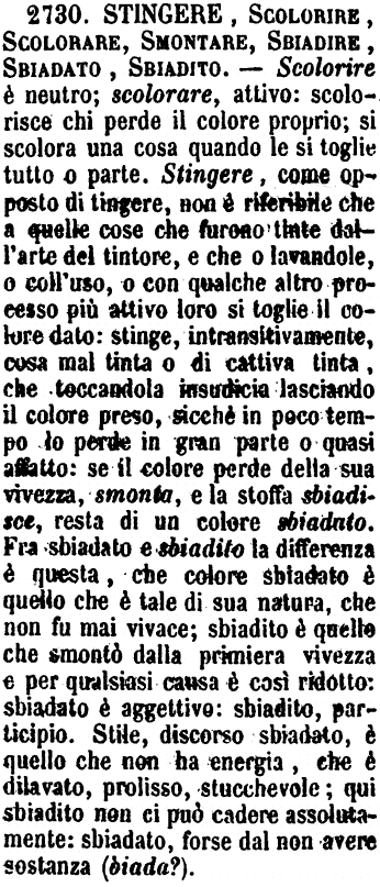 | Stingere, Scolorire, Scolorare, Smontare, Sbiadire, Sbiadato, Sbiadito - Scolorire è neutro; scolorare, attivo: scolorisce chi perde il colore proprio; si scolora una cosa quando le si toglie tutto o parte. Stingere, come opposto di tingere, non è riferibile che a quelle cose che furono tinte dall'arte del tintore, e che o lavandole, o coll'uso, o con qualche altro processo più attivo loro si toglie il colore dato: stinge, intransitivamente, cosa mal tinta o di cattiva tinta, che toccandola insudicia lasciando il colore preso, sicchè in poco tempo lo perde in gran parte o quasi affatto: se il colore perde della sua vivezza, smonta, e la stoffa sbiadisce, resta di un colore sbiadato. Fra sbiadato e sbiadito la differenza è questa, che colore sbiadato è quello che è tale di sua natura, che non fu mai vivace; sbiadito è quello che smontò dalla primiera vivezza e per qualsiasi causa è così ridotto: sbiadato è aggettivo: sbiadito, participio. Stile, discorso sbiadato, è quello che non ha energia, che è dilavato, prolisso, stucchevole; qui sbiadito non ci può cadere assolutamente: sbiadato, forse dal non avere sostanza (biada?). [immagine] |